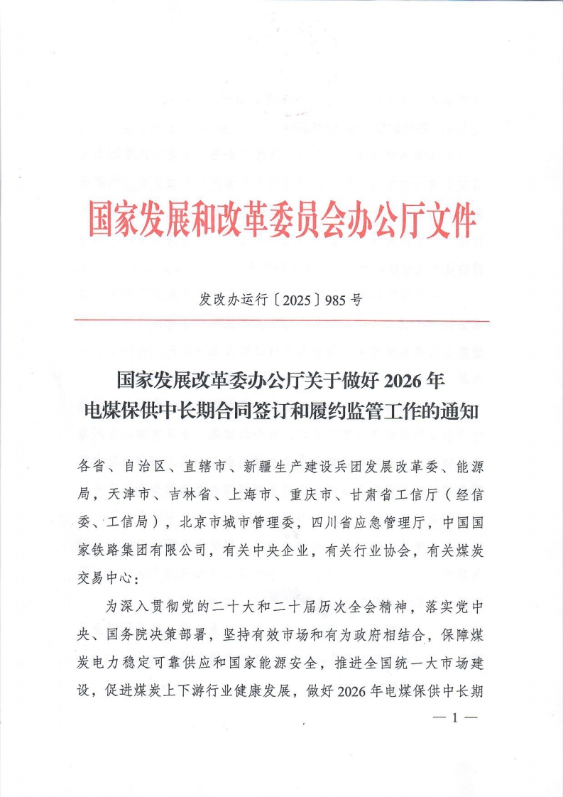 国家发展改革委办公厅关于做好2026年电煤保供中长期合同签订和履约监管工作的通知(8)
