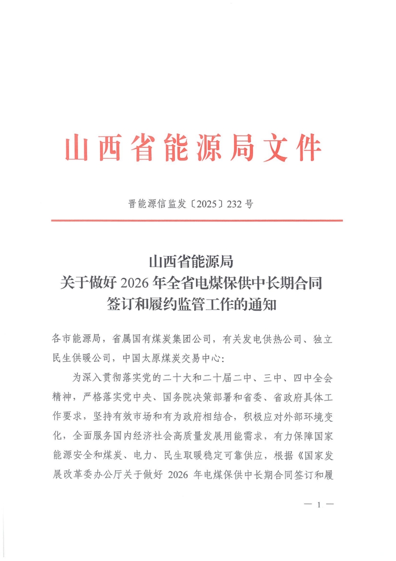 山西省能源局关于做好2026年全省电煤保供中长期合同签订和履约监管工作的通知